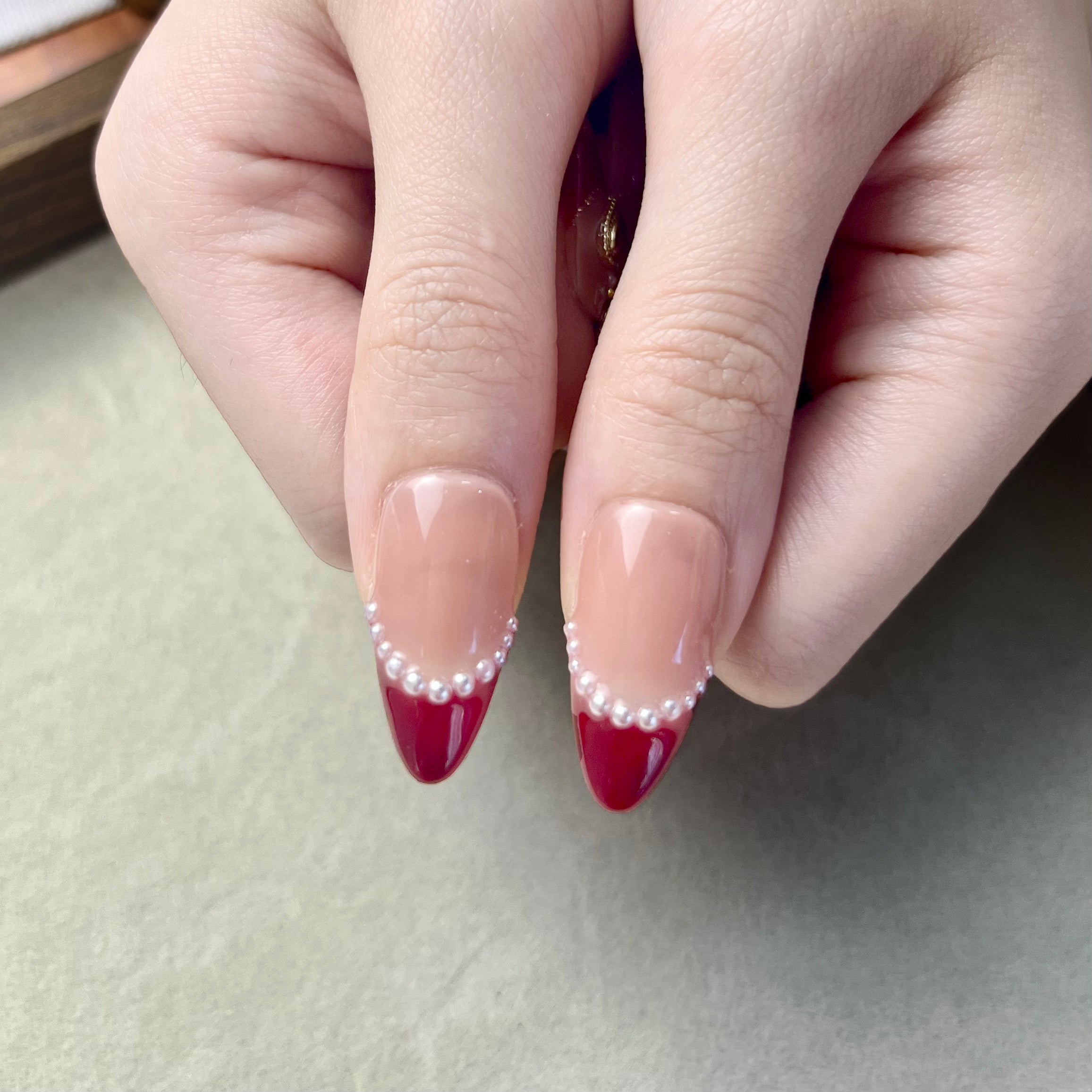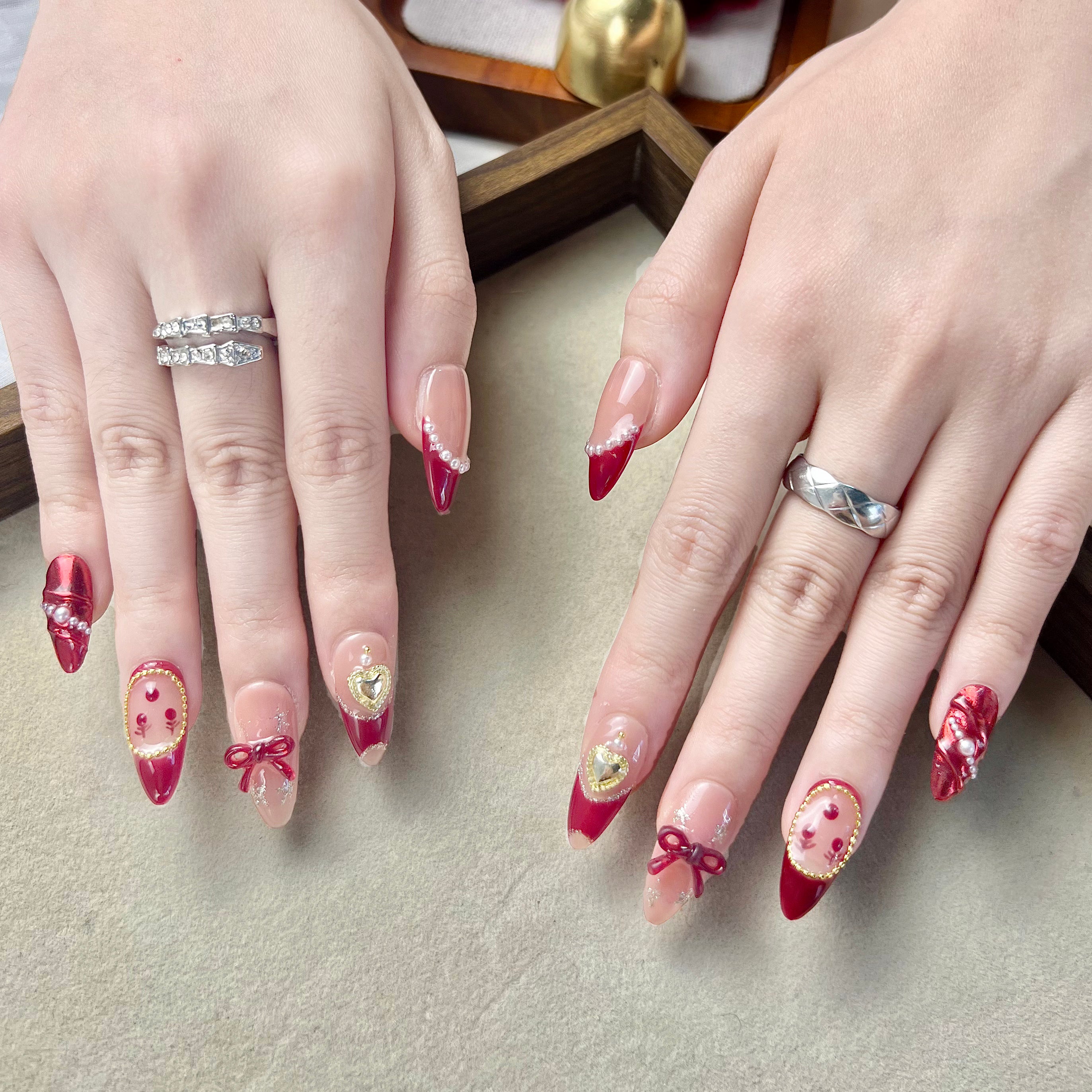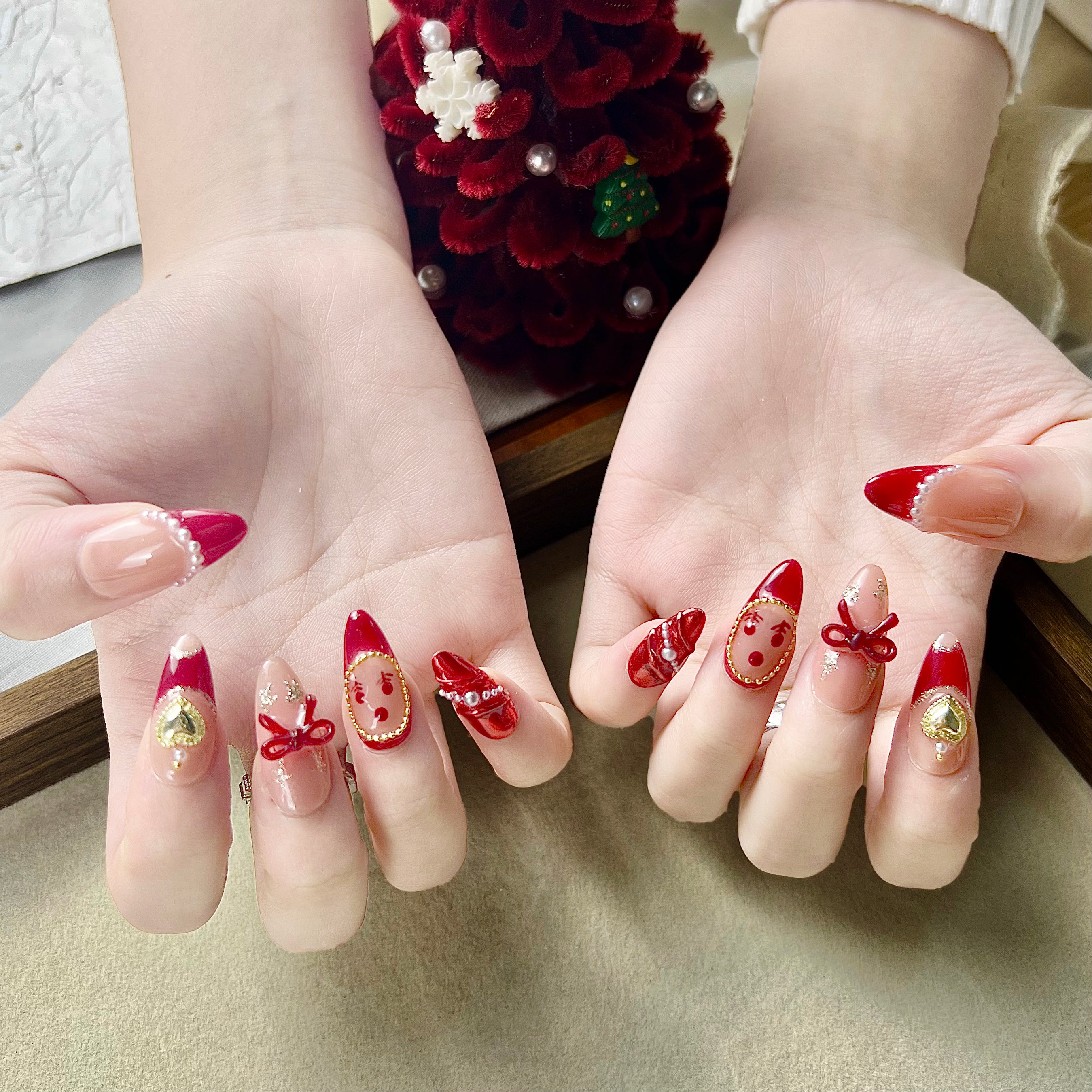 • NAILOVE Red French-style pearls with bow decorations adorn the Christmas manicure.